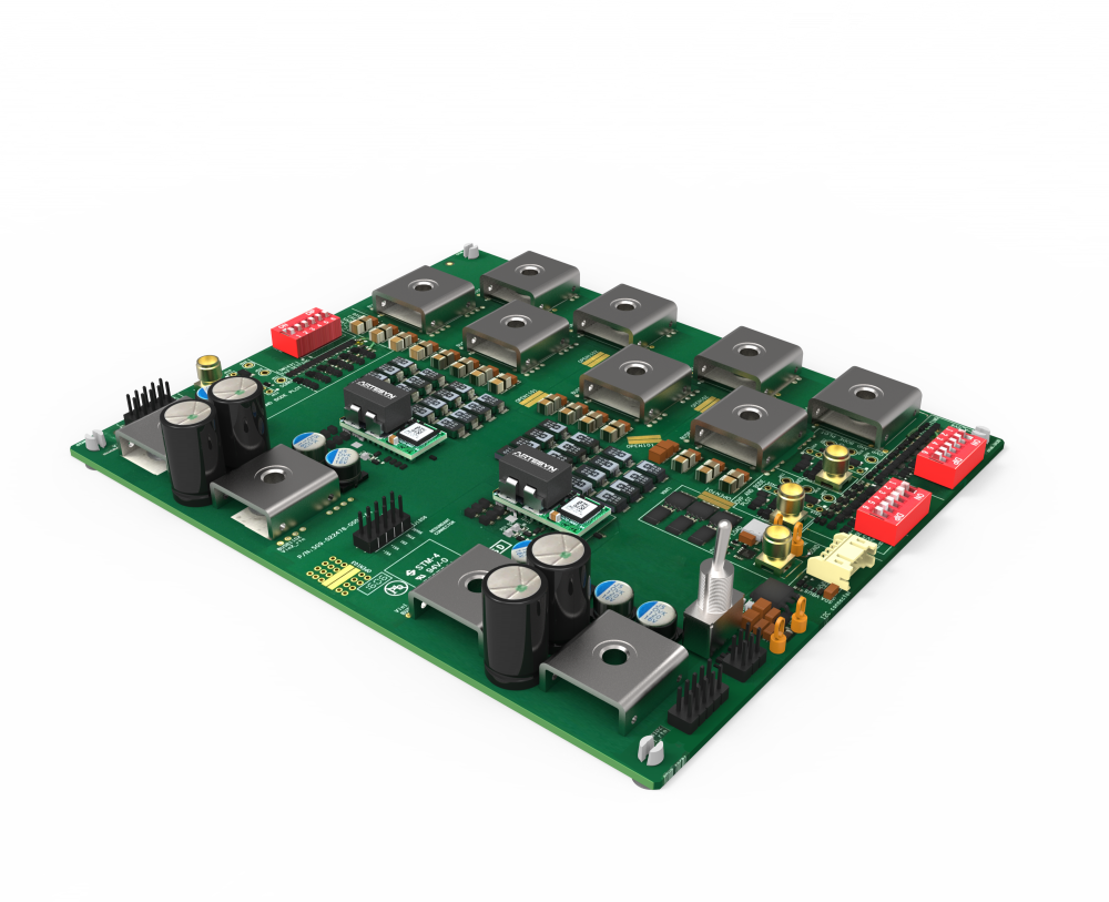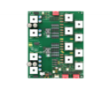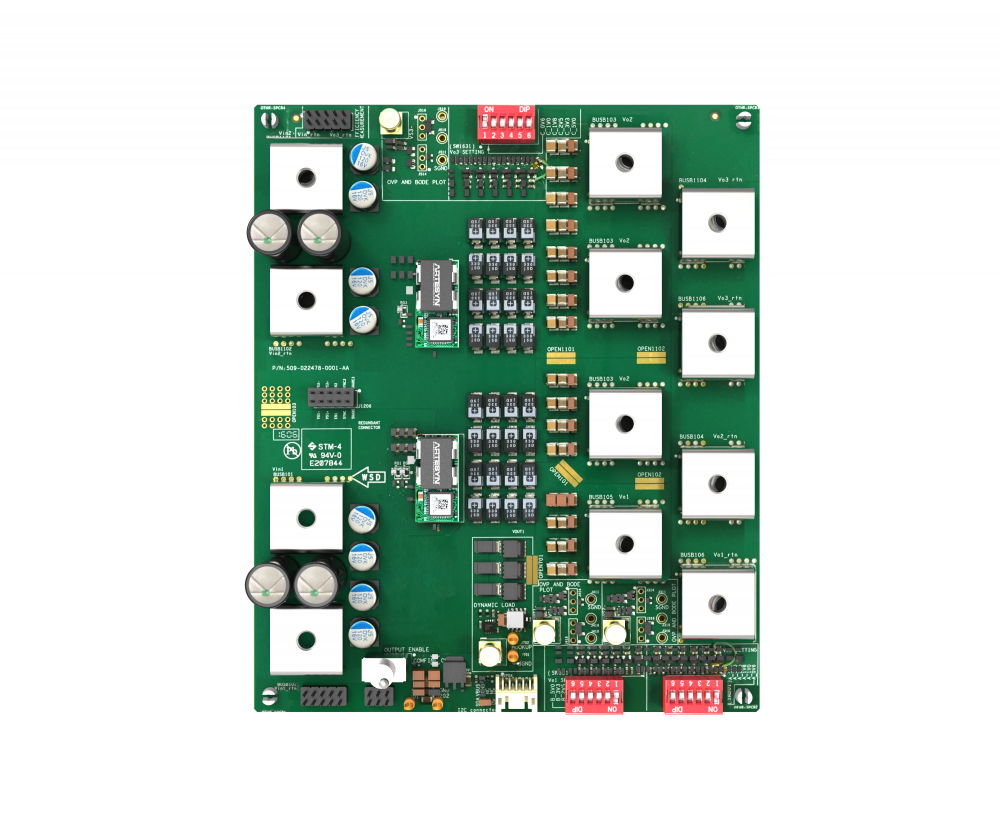 The connections to the evaluation board are via M6 screws, with the only provision being that the input voltage is in the 7.5 to 14 V range. The output connections use the same M6 screws, however, if you want to connect the outputs in parallel or you wish to stack the modules, they are placed in such a way to make the operation of placing a link between them as easy as possible. The demonstration board is populated with two LGA80D modules, allowing you to test independent channel or stacked-module operation.