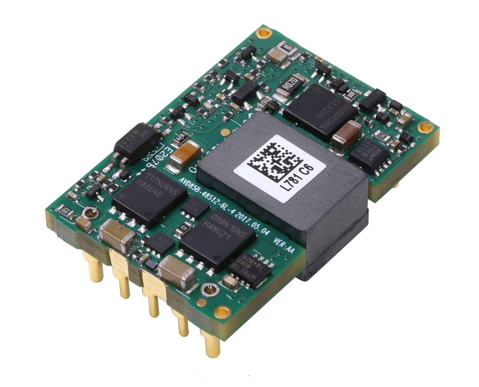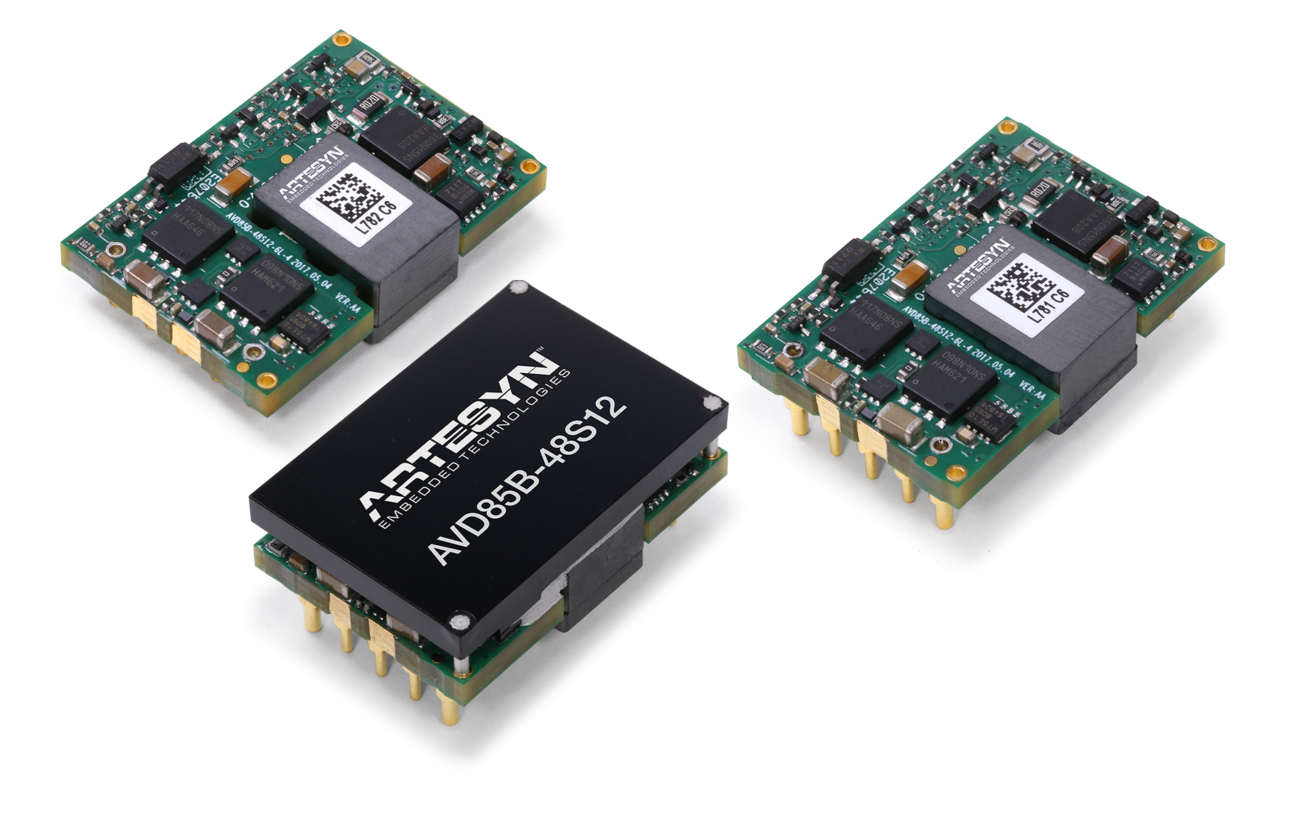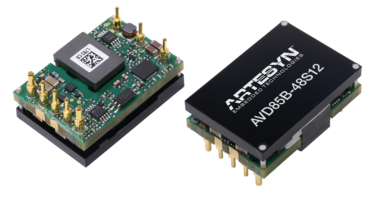 The AVD85B series sixteenth-brick isolated DC-DC converter provides a fully regulated single output at 5 V or 12 V that is capable of delivering up to 85 W. It has a wide 2:1 input range of 36 to 75 VDC and is designed primarily for use with standard 48 V telecommunications equipment supplies. Rated at 85 W, the converter employs an open-frame construction, offers up to 93% efficiency and accommodates an ambient operating temperature range of -40 to 85˚C. A baseplate option is available for enhanced thermal performance. SMT bullet pin with reel tape package is available for reflow processing. The converter uses fixed frequency switching to minimize the need for external EMI filtering.