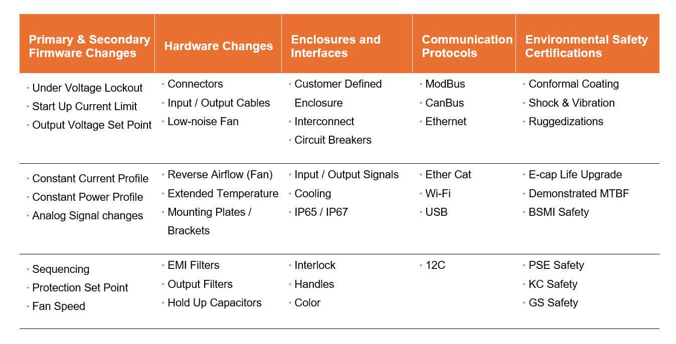 - Benefits of modified standard power supplies: Modified standard PSUs offer a cost-effective and faster alternative to full-custom designs. They retain the reliability, certifications, and supply chain stability of standard models while allowing tailored modifications in electrical, mechanical, and firmware aspects.