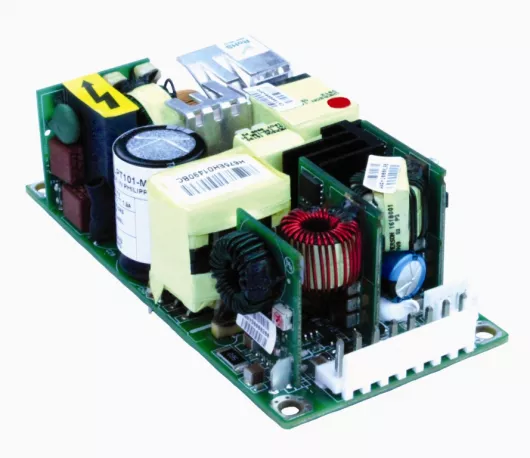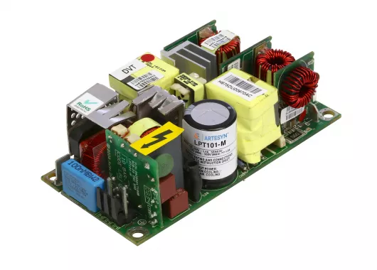 The LPT100-M series of triple output open-frame AC-DC power supplies features ITE and medical safety approvals. There is a choice of four models, covering output voltages from 3.3 V to 24 V. The power supplies have a typical full load power conversion efficiency of 82% and with a height of only 1.28 inches offer a power density in excess of 12 W per cubic inch. LPT100-M power supplies are primarily designed for use in information technology equipment (ITE) and light industrial systems, as well as for equipment intended for non-patient contact and non-patient critical use in low power medical, dental and laboratory applications.